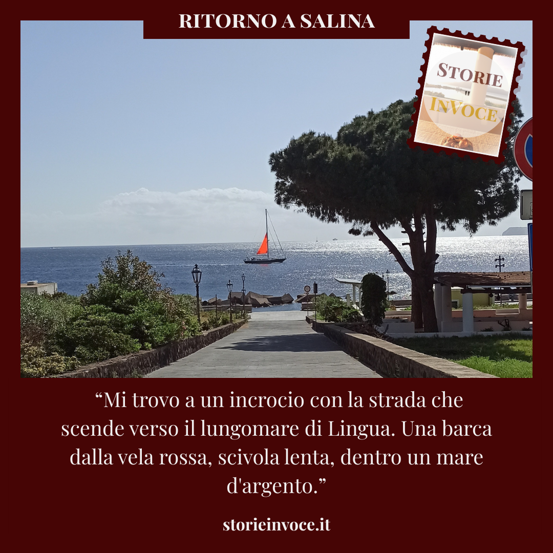 Quando esco per andare a prendere il pulmino, questa volta mi dirigo verso il paese. I vicini, che non sapevo di avere, mi hanno suggerito, di fare acquisti in un piccolo negozio di alimentari che si incontra sulla strada. Ma è ancora presto e lo trovo chiuso. Mi siedo così sul muretto vicino. Mi trovo a un incrocio con la strada che scende verso il lungomare di Lingua. Una barca dalla vela rossa, scivola lenta, dentro un mare d’argento.